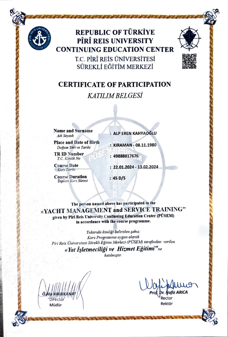 Yurt dışı Motoryat,Gulet ve Yelkenli seyir tecrübem çok iyidir Hırvatistan,İspanya,Fıransa,Beyrut,Kıprıs,İtalya ve yunanistan adalarının tamamına kaptan olarak gittim birçok yatta tek çalıştığım için hem kaptan hem aşçılığını yaptım yat bilgim tamir ve bakım işlerinden anlarım ve olası sorunlara müdahale etmek için Yeterli bilgi ve tecrübeye sahibim